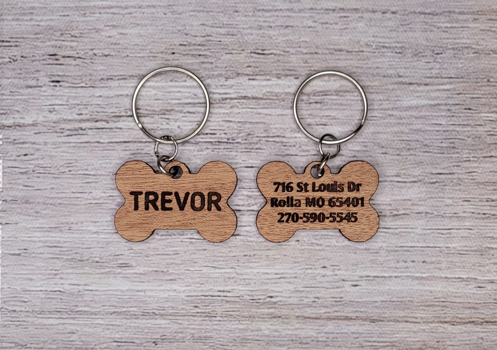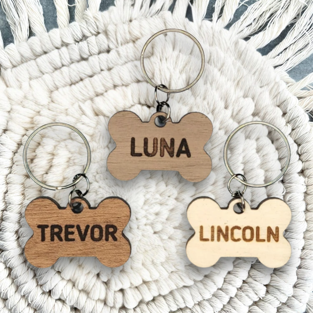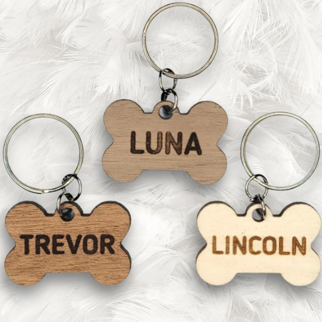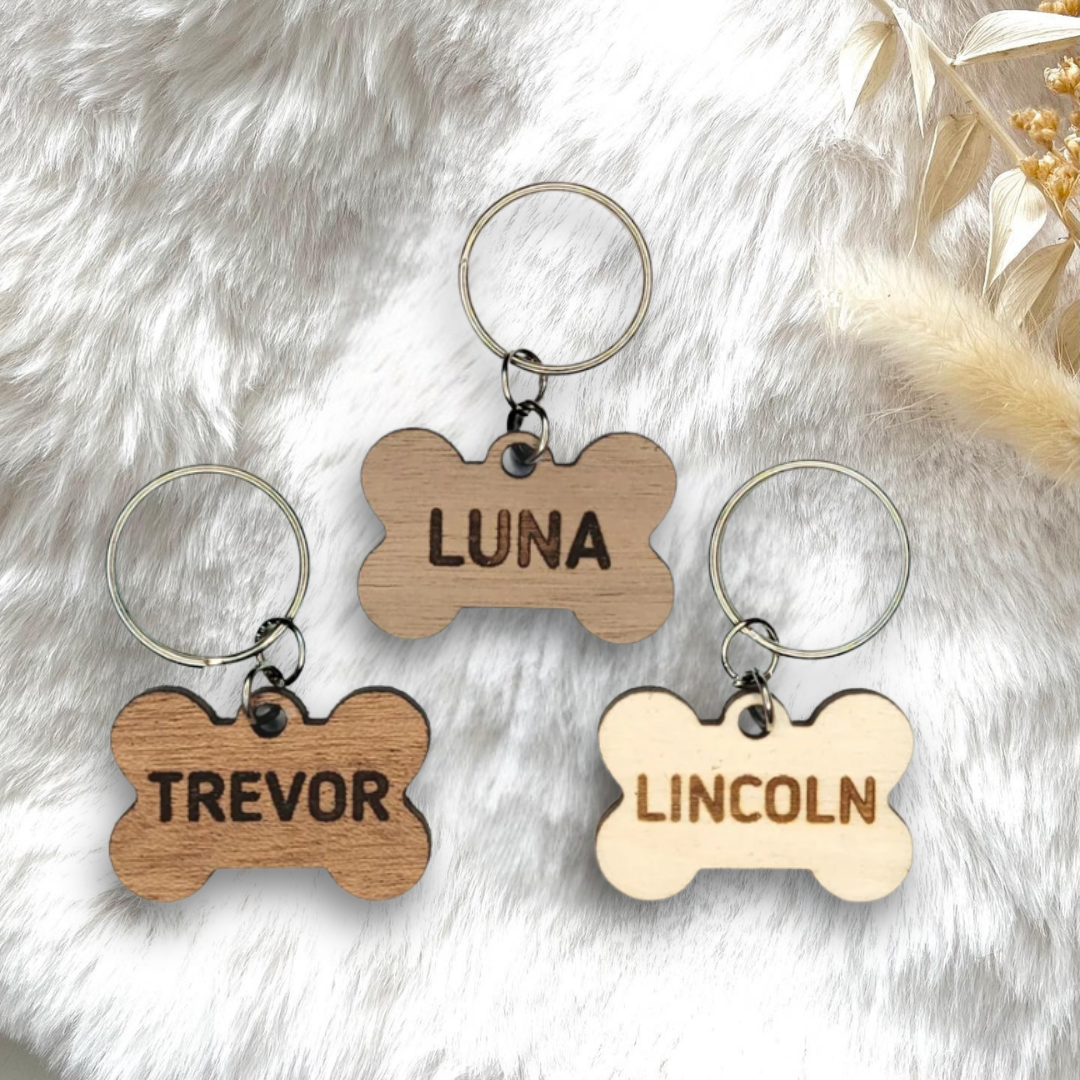 Details. This custom wood bone-shaped pet tag is the perfect, unique, and trendy tag for your furry best friend! Engrave the name on the front and the other info on the back.