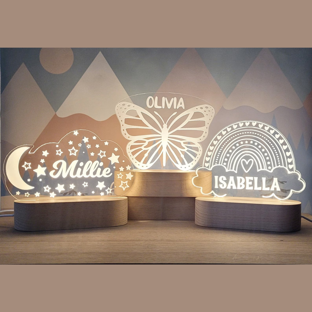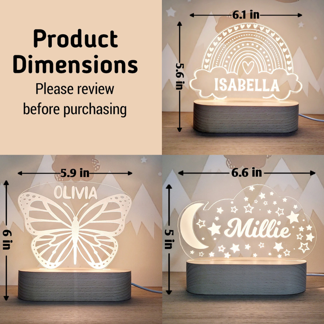Cute night light for kid's room engraved in acrylic, Customize the acrylic night light with your name. The sign comes with a wooden light base that has a warm white light. Perfect for kid's bedroom decor nursery decor and a great new baby gift. The light is powered by a USB cord that is included (wall plug adapter not included)