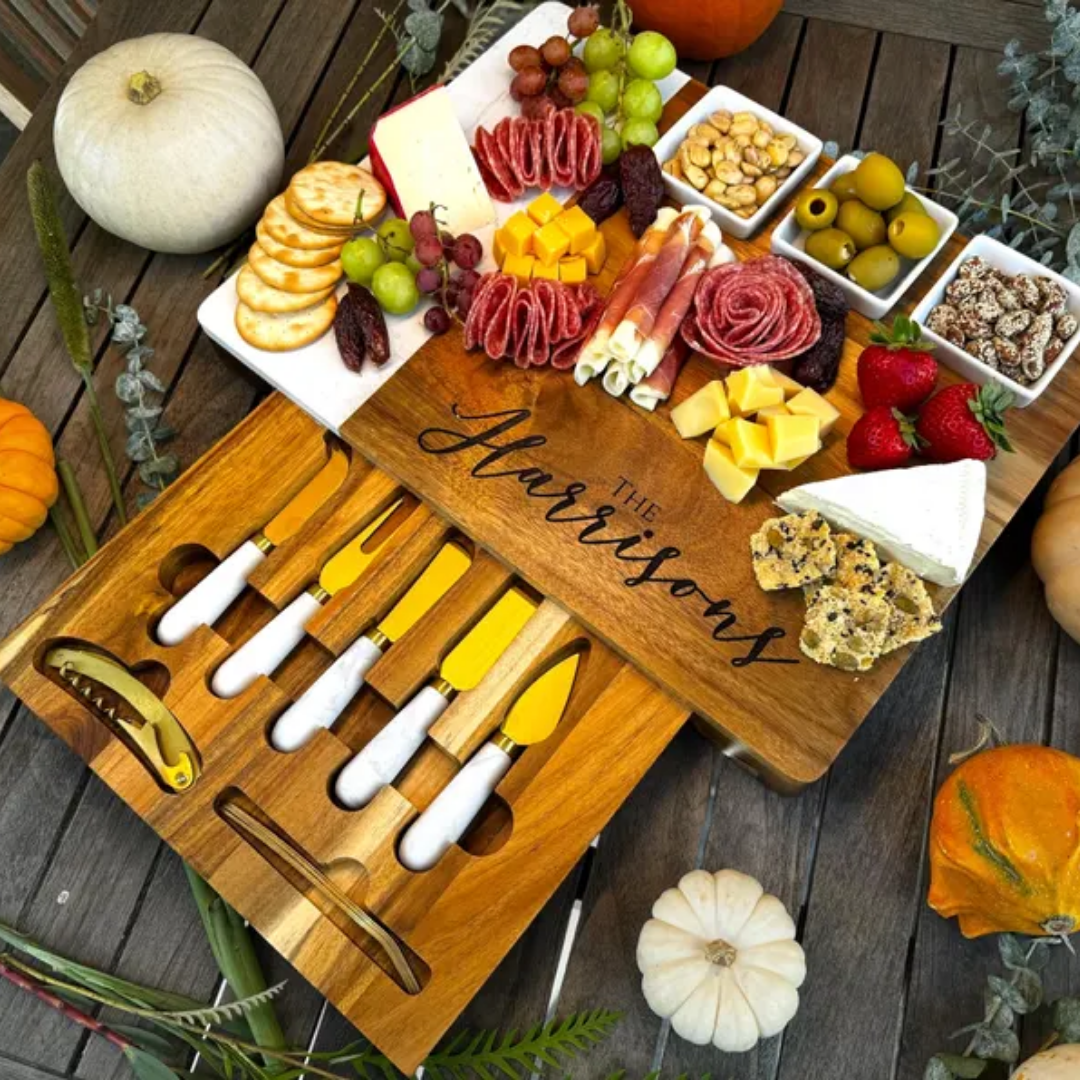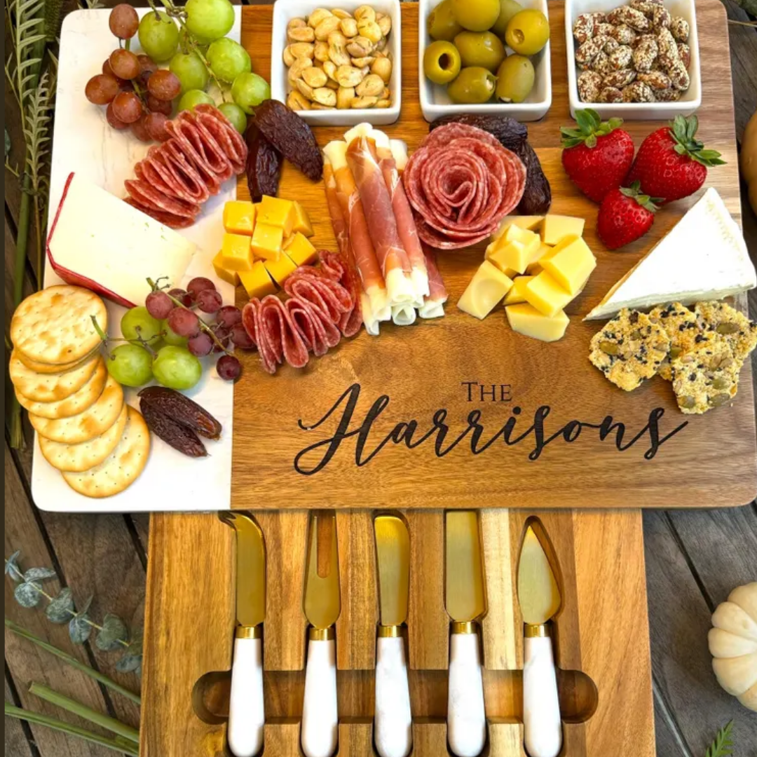 The board can be personalized with a family name (The Harrisons, Brad & Jackie, Est. 2022), a cute saying, a wedding date, etc.