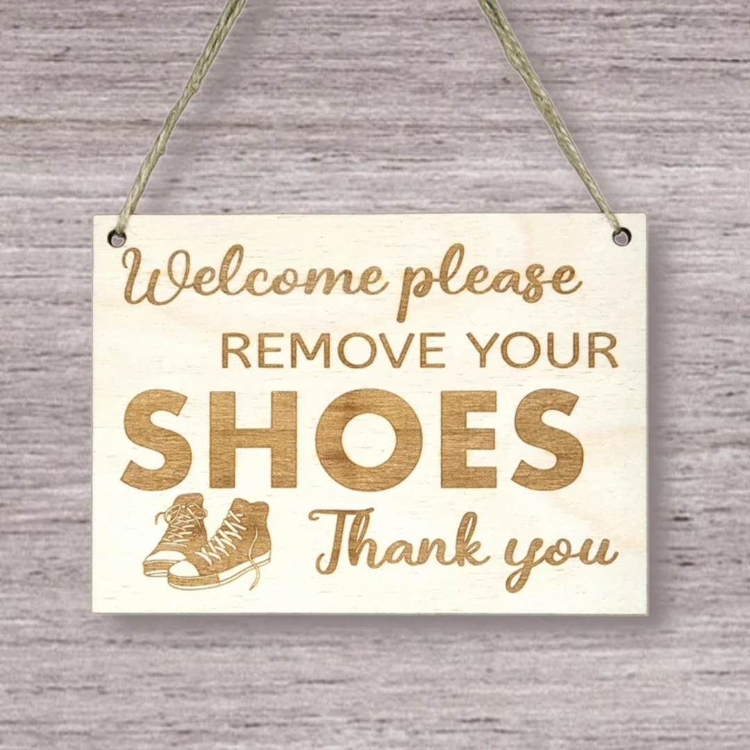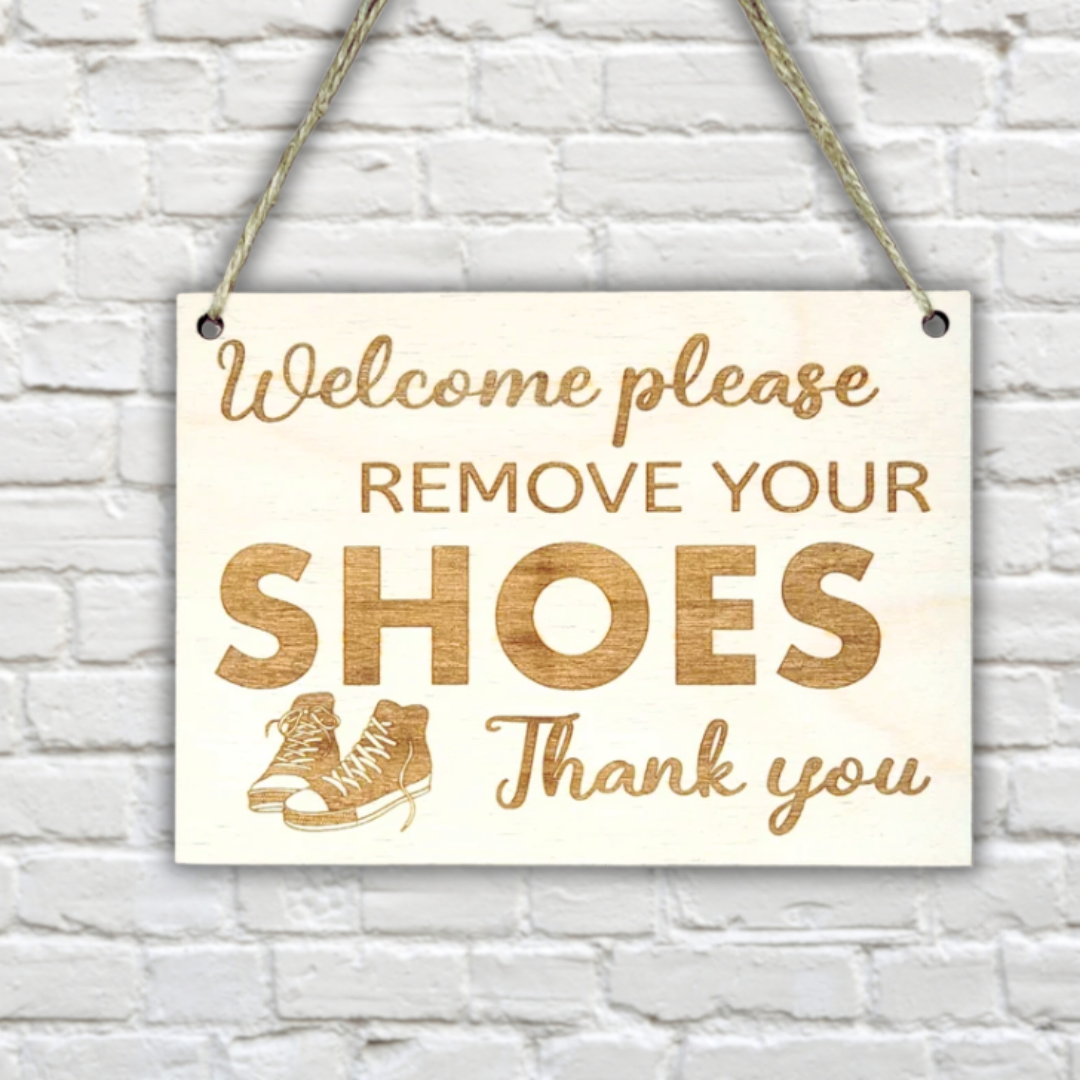Wood engraved easy to hang on the front door, wall or hook, etc. Remind guests and kids to remove their shoes before entering your house. Engraved in baltic birch wood comes with a string to hang on the hook of a doorbell