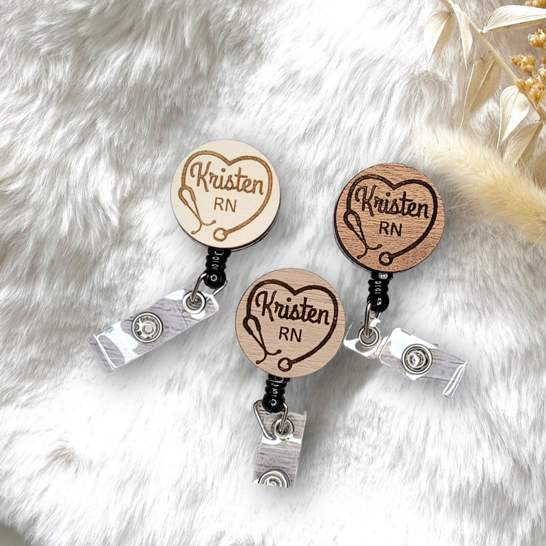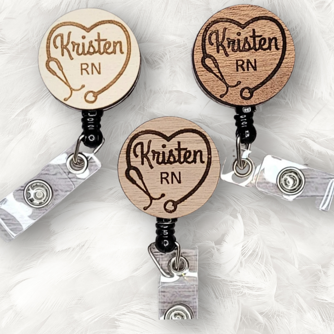 Beautiful customized nurse badge reel. Engrave your name and credentials into a wooden badge reel. The badge reel comes with a clip on the back. You can engrave your name in 3 wood types and with 3 different fonts.