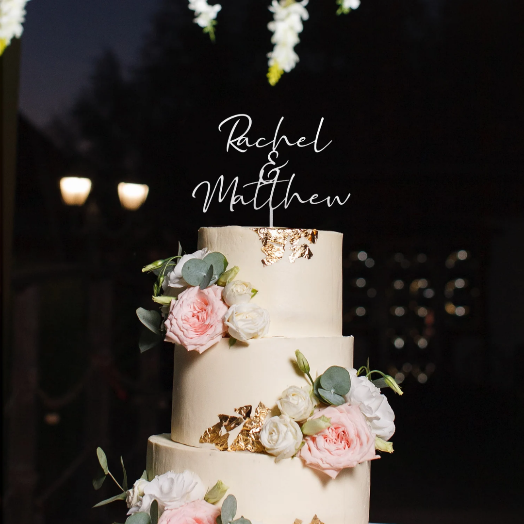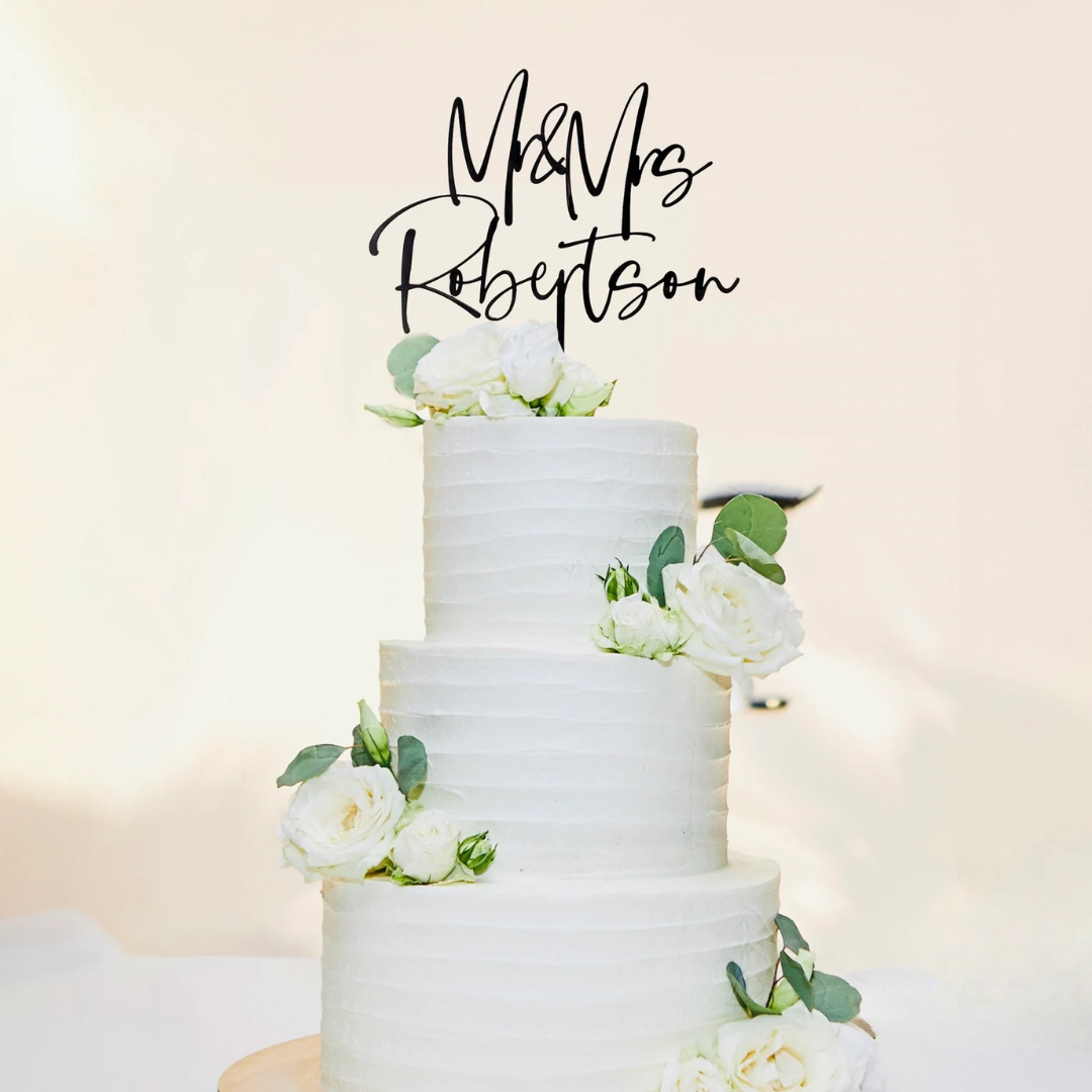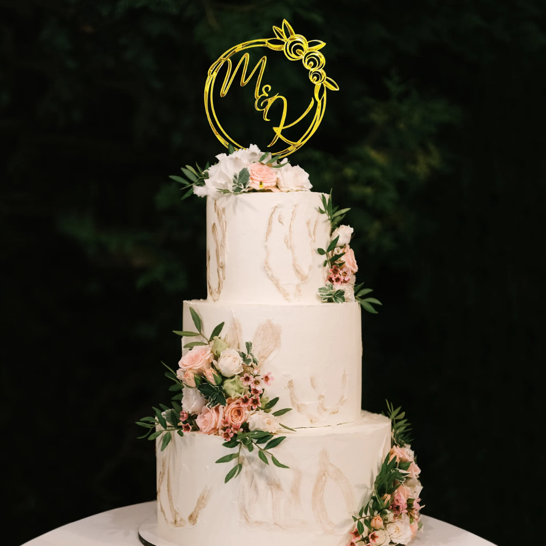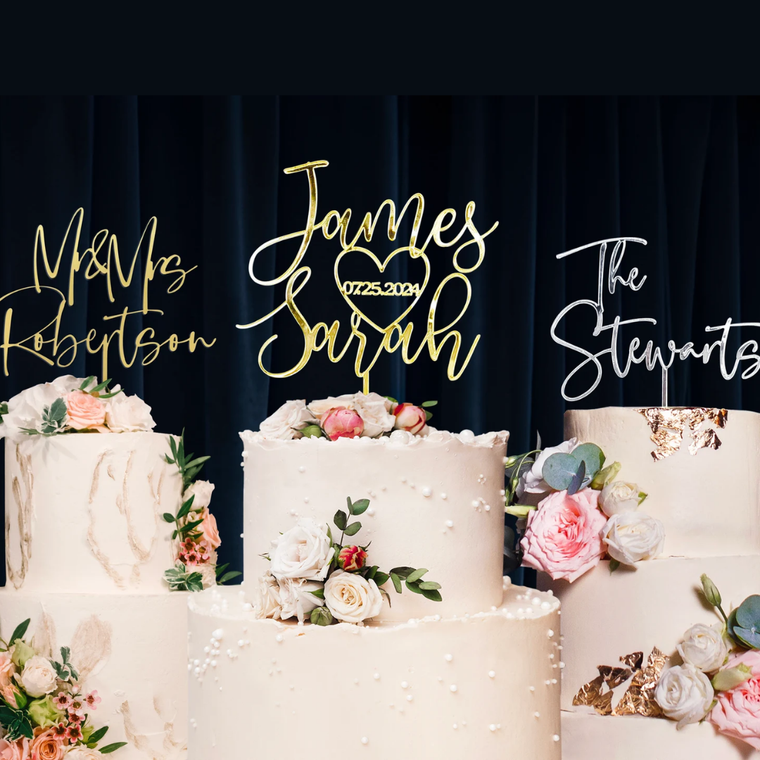 Add a touch of elegance to your special day with our custom wedding cake toppers. Perfect for any wedding style, these toppers can be personalized with your names, initials, and dates. Choose from a variety of designs, from a simple "Mr. and Mrs." cake topper to a heart-shaped cake topper, and a variety of materials, including gold mirror, silver mirror, pink mirror, gold metallic, black, white, and natural wood. Our toppers are the perfect wedding accessories to complete your cake decor and make your celebration memorable.
